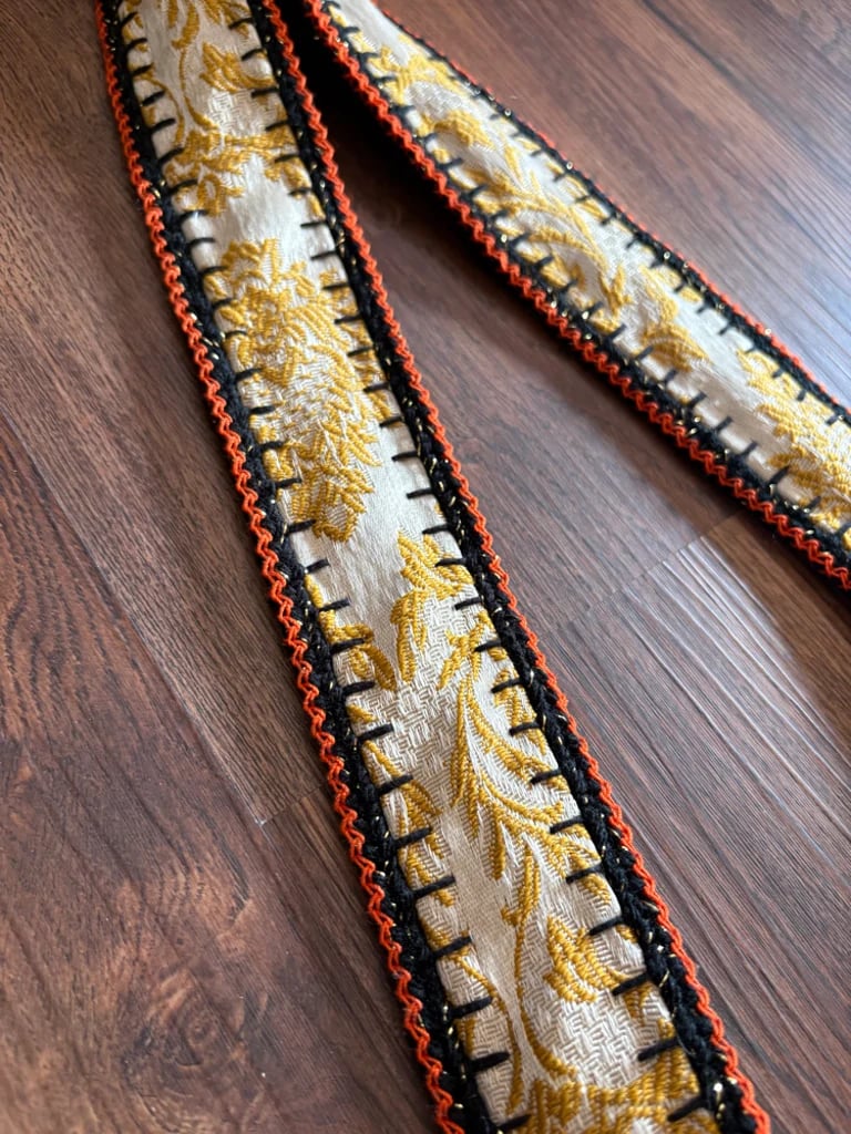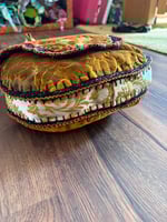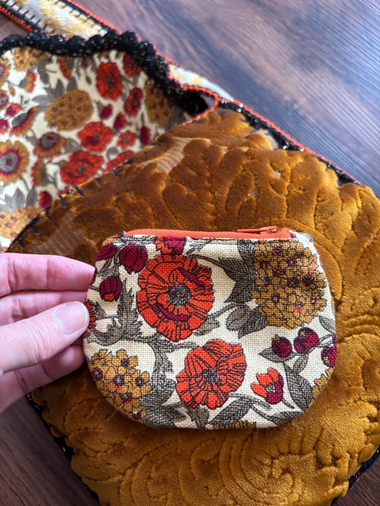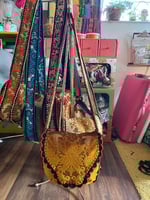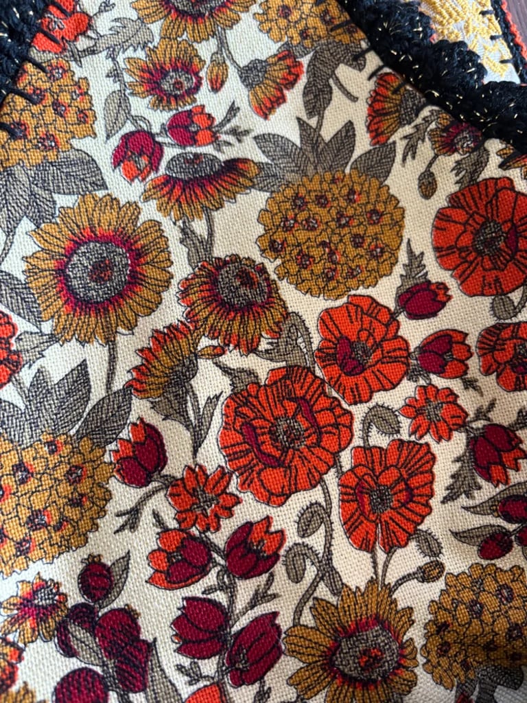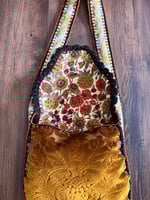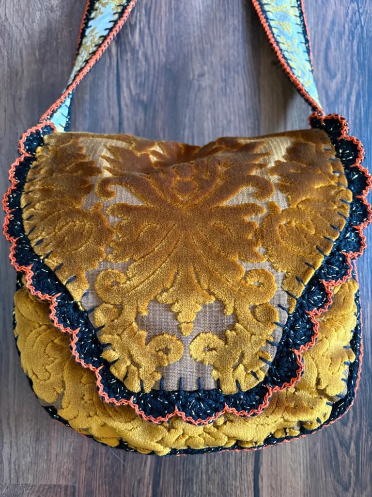 This one features a lovely damask print cut velvet upholstery fabric in a bright yellow gold color! It's lined with a floral cotton duck fabric in lovely autumnal colors, also vintage. The strap goes all the way around the purse and is done in a different fabric, this one is a drapery fabric and was a curtain in it's past life! Each piece is blanket stitched by hand, then I've crocheted around each piece with black yarn, then the pieces are crocheted together. I've finished this one off with a dainty little scallop stitch in a black with metallic gold yarn for a subtle sparkle, then finished off with a burnt orange trim to compliment the interior fabric. It comes with a matching coin purse too! All bags are made with reclaimed materials, most of which are vintage down to the thread! I put an incredible amount of thought, time, love and good energy into each of these bags, they take days to make and each one is one-of-a-kind! They are very durable and will fit quite alot inside! I hope you love them as much as I do.